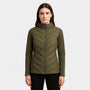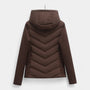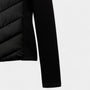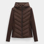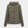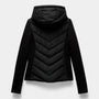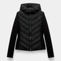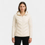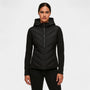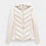 A hybrid jacket with a chevron-quilted front and smooth softshell sleeves and sides. Cut to hip length with a close, feminine line, it layers effortlessly for cool-day commutes and weekend walks.