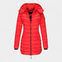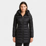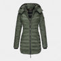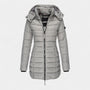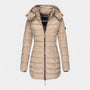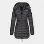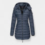 A longline quilted puffer with an attached hood and clean, minimalist lines. Cut to mid-thigh, it adds dependable warmth without bulk—easy over denim and knits for everyday wear.
